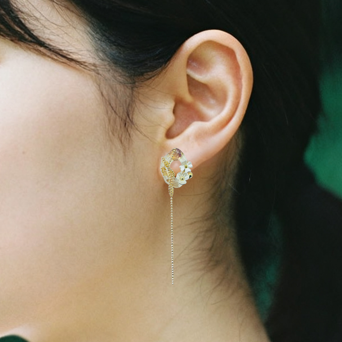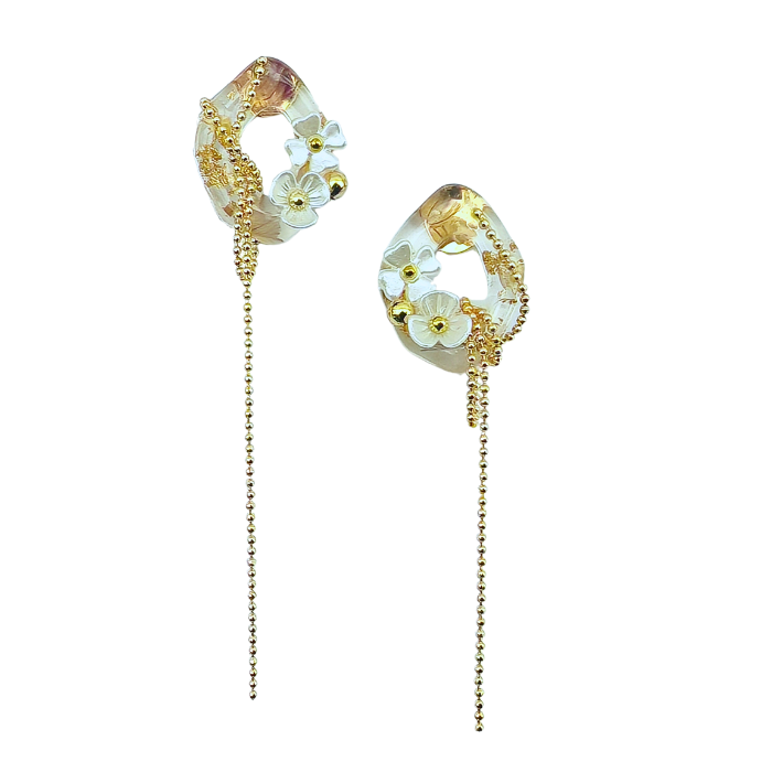 クリアな樹脂フレームに、繊細な白い小花とゴールドビーズを閉じ込めたデザインピアス。